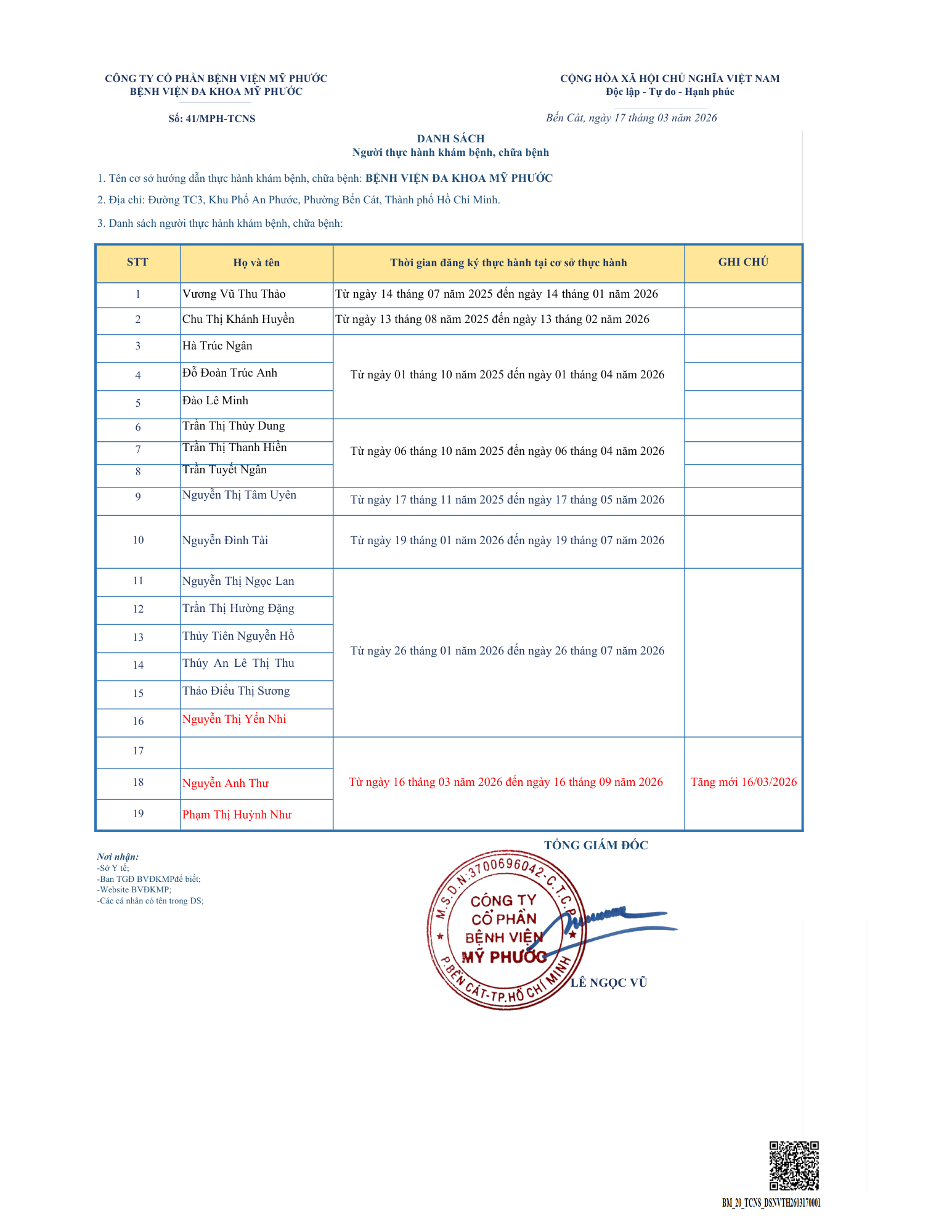 DANH SÁCH HỌC VIÊN ĐĂNG KÝ THỰC HÀNH THÁNG 03/2026