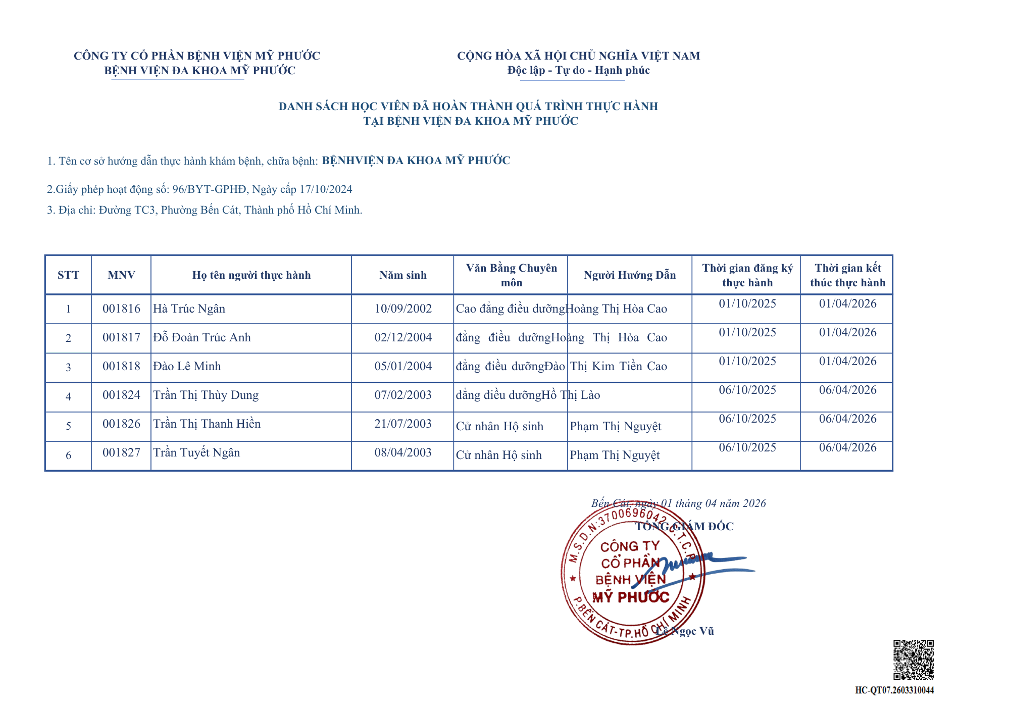 DANH SÁCH HỌC VIÊN HOÀN THÀNH THỰC HÀNH THÁNG 04/2026