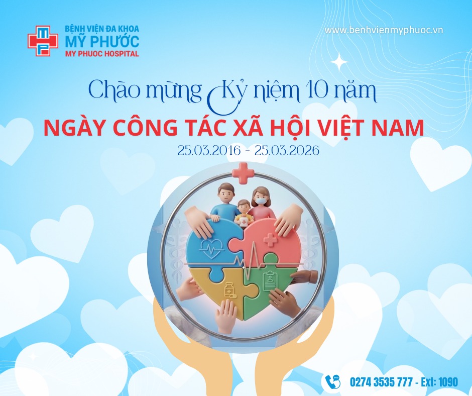 Nhân kỷ niệm 10 năm Ngày Công tác xã hội Việt Nam (25/03/2016 -25/03/2026). Bệnh viện Đa khoa Mỹ Phước trân trọng gửi lời chúc sức khỏe, hạnh phúc và thành công đến tất cả những người đã, đang và sẽ gắn bó với công tác xã hội.