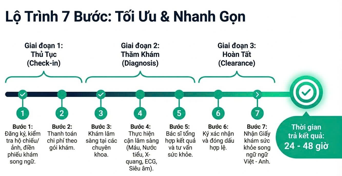 • Bước 7: Trả kết quả (giấy khám sức khỏe song ngữ Việt – Anh) - Thời gian trả kết quả: 24 – 48 giờ