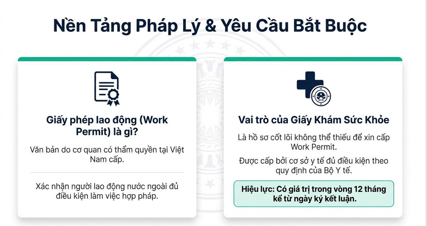 Người lao động nước ngoài khi làm việc tại Việt Nam bắt buộc phải có Giấy phép lao động (Work Permit). Trong đó, Giấy khám sức khỏe hợp lệ là thành phần hồ sơ quan trọng, bắt buộc.